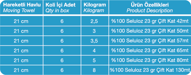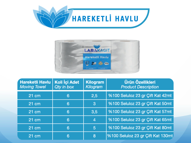 Lara Kağıt Hareketli Havlu, üstün emiciliği ve dayanıklı yapısıyla yoğun kullanıma uygun, ekonomik bir temizlik çözümüdür. Özel hareketli yapısı sayesinde tek elle kullanım kolaylığı sunar, israfı önler ve hijyen standartlarını yükseltir. Ev, ofis, restoran ve endüstriyel alanlarda güvenle tercih edilebilir.